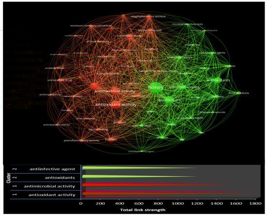 The map categorizes terms into two significant clusters, with respective colors. The color of an item is determined by the cluster to which it belongs. Moreover, the closer two items are located on the map, the stronger their relatedness. Figure 11 represents the two cluster items with the best score for total link strength. Moreover, total link strength measures each keyword’s significance through an assigned weight in VOS software. As such, antioxidant and antimicrobial activity are the items in the first cluster (red color) with the best score, confirming the essential search terms. Honey, anti-infective agents, and antioxidants belong to second cluster (green), with the best score for total link strength (Figure 11).