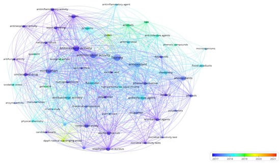 A visualization of the selected keywords and the evolution of research using the total link strength of VOS viewer is shown in Figure 12. The research trends of the last five years, 2017–2021, are also given. The initial research focus in this domain was primarily on honey’s anti-inflammatory and antineoplastic activity, wound healing, and antibacterial agents.