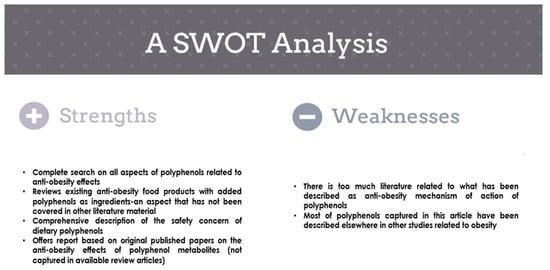 Obesity results from the excessive accumulation of body fat due to an imbalance between energy intake and expenditure. Obesity is a risk factor for several other chronic disorders, including type 2 diabetes mellitus, cardiovascular diseases, stroke, dementia, osteoarthritis, and breast, colon, and prostate cancers [1,2]. It can contribute to a decline in life quality and expectancy and may also lead to many other psychological problems. Modifying lifestyle is considered the most appropriate approach to reducing obesity [1]. In particular, adjusting an individual’s diet to include healthier foods is vital in weight management. Globally, obesity is constantly growing in prevalence and significance, posing a threat to health. Once just a problem of wealthy nations, obesity now impacts more countries at all economic levels, bringing with it a wave of ill health and loss of productivity among the population. The worldwide prevalence of the disease has doubled since the beginning of 1980 [3]. Today, obesity is considered one of the most serious public health concerns, with the latest figures from the World Health Organization’s database showing that about one in ten young people, ages 5–17, are overweight or obese, while the condition is even severe among middle-aged people [3]. Bariatric surgery and synthetic drugs (such as orlistat and naltrexone/bupropion, glucagon-like peptide-1 receptor agonists) have been accepted as therapeutic strategies for obesity. However, these treatment methods have been associated with unpleasant side effects that limit their use [4]. As a result of these concerns, other alternative approaches are needed to help fill this gap and reduce the impact of obesity among the population. This challenge has led to more research on obesity, including assessing the effect of polyphenols on disease. Polyphenols are vital phytonutrients of plant origin that can be incorporated as functional ingredients in foods to offer an effective natural therapy against obesity. There have been efforts to discover alternative obesity treatments from dietary polyphenols [1,2]. Although several other papers have been on this subject, the current article reviewed the most current knowledge on the relationship between plant-derived polyphenols and obesity. The cellular, animal, and human data supporting the anti-obesity potential of phenolic compounds have been summarized. The information presented in the review is unique in revealing the potential role of polyphenols in weight management and their safety-related issues. The article offers the most comprehensive evidence, combining the incorporation of polyphenols into foods, safety aspects, bioavailability, and related research limitations in preclinical and clinical studies in an attempt to provide a lead for more studies regarding foods targeting obesity. However, this article has some weaknesses as described in Figure 1.
