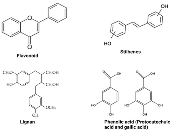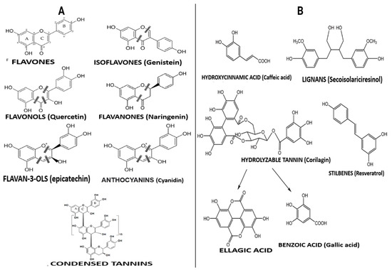 Polyphenols are compounds with several hydroxyl groups on an aromatic ring. Most of these compounds can be found in several plant foods, including tea leaves, cereals, legumes, and fruits, while some are mainly associated with specific foods (e.g., isoflavones in soya, phloridzin in apples, flavanones in citrus, etc.). They can be grouped into two broad categories: flavonoid-type and non-flavonoid-types with distinct structures (Figure 2). These groups are discussed below.