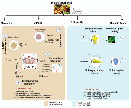 Non-flavonoid polyphenols are diverse in foods. They are categorized into phenolic acids, lignans, and stilbenes. Phenolic acids are widely distributed in foods and can be found in high concentrations in grains, wine and berries. They may include and are not limited to caffeic acid, caftaric acid, ferulic acid, chlorogenic acid, and benzoic acid. Many physicochemical factors such as polarity, plant matrix, digestibility by gastrointestinal enzymes, and molecular mass can affect their bio-accessibility and bioavailability. Foods with high phenolic acid content have beneficial effects against obesity, primarily via modulating gut microbiota composition [22]. On the other hand, lignans consist of compounds with 1,4-diarylbutane in their structure. They include pinoresinol, secoisolariciresinol, syringaresinol, matairesinol, and lariciresinol diphenolic. These compounds are mainly found in fruits, vegetables, coffee, tea, and cereal products. When consumed, lignans express anti-obesity activity by inhibiting the expression of adipogenic factors and lipid metabolism-regulating factors during adipocyte differentiation [28]. They are also said to be involved in inducing G0/G1 cell cycle arrest, inhibiting mitotic clonal expansion during the early stage of adipogenesis [28]. The bioavailability of lignans requires biotransformation reactions involving demethylation and dehydroxylation, which are directly dependent on intestinal bacterial metabolism [22]. Moreover, stilbenoids may be found in red grapes, cranberries, strawberries, and peanuts [22]. Resveratrol and its derivatives are the most known stilbenoids in the diet and probably the most significant and widely studied stilbenoids. Their metabolized form, such as dihydroresveratrol and 3,4′-dihydroxy-trans-stilbene (from trans-resveratrol), are responsible for their anti-obesity effects.