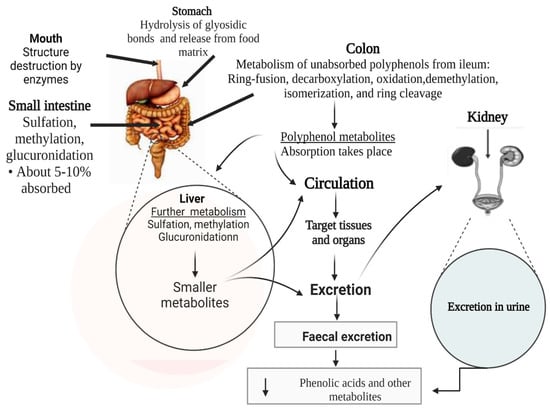 Absorbed polyphenol products, through the bloodstream, rapidly reach the liver, where they are further hydrolyzed by phase II metabolism before they are eventually excreted outside the body via urine. At the same time, the unabsorbed polyphenols, mostly flavonoids linked to a rhamnose moiety, organic acids, lipids, and polymers, and those bound to dietary fiber and protein, as well as hydroxycinnamic acids esterified to sugars, reach the colon for further digestion; they cannot be directly absorbed in the small intestine. In the colon, gut microbiota hydrolyses the unabsorbed polyphenols to give rise to small phenolic acids and aromatic catabolites [120,121]. These polyphenol by-products are absorbed into the blood and arrive in the liver, where they are further metabolized before being released in urine; however, some of the unabsorbed metabolites from the parent polyphenols are eliminated via feces [120,121]. Figure 5 offers a detailed summary of the polyphenol metabolic process along the human gut.