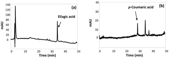 To extract phenolic compounds from the fermented strawberry distillate production waste, DMSO was chosen as the solvent based on its ability to dissolve a wide range of most polar and non-polar natural phenolic compounds and on its compatibility with cellular assays. HPLC analysis of the extract after proper dilution in methanol (Figure 1) showed the presence of a main compound eluted at ca. 35 min, which was identified as EA based on LC-MS analysis and on the comparison of the chromatographic properties with those of an authentic standard. Furthermore, the elutographic profile recorded at 320 nm showed, besides EA, very low amounts of a compound eluted at ca. 28 min, identified as p-coumaric acid. The quantitative analysis allowed us to determine the concentrations of EA and p-coumaric acid in FSE as 0.170 ± 0.003 mg mL−1 and 0.004 ± 0.001 mg mL−1, respectively. Although the occurrence of both compounds has previously been reported in strawberries [35,36], several papers in the literature have described the increased formation of EA as well as of p-coumaric acid in fermented plant products, likely as the result of hydrolytic processes brought about by microorganisms [12,14,37,38,39]. Indeed, none of these compounds was found to be present in the DMSO extract of fresh strawberries of the same variety (strawberry extract, SE) (Figure S1), suggesting their actual generation during the fermentation process.