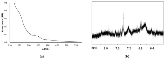 The UV-Vis spectrum of FSE showed a maximum at around 360 nm (Figure 2a), as expected based on the presence of EA. Notably, no other low molecular weight phenolic compounds were found to be present in FSE, as evident also from 1H NMR analysis. In fact, the aromatic region of the spectrum (Figure 2b) was characterized by the presence, besides the signal due to EA at ca. 7.4 ppm, of very broad signals likely indicative of the presence of heterogeneous phenolic polymers.