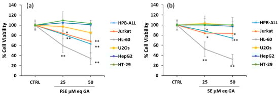 To verify the biological potential of FSE, its antiproliferative activity was investigated on a panel of different in vitro cellular models, represented by solid tumor and leukemic cell lines differently sensible to cell death, namely: a promyelocytic leukemia cell line (HL-60), two leukemia T cell lines (HPB-ALL and Jurkat), a human colon cancer cell line (HT-29), a hepatoma cell line (HepG2), and a human osteosarcoma cell line (U2Os). Cells were treated for 24 h with the extract at 25 and 50 μM gallic acid equivalent (eqGA) and, as reported in Figure 3a, the treatment significantly reduced the viability of the three leukemic cell lines (HL-60, HPB-ALL and Jurkat cells), while modest or null effects were observed in the solid tumor cell lines (HT-29, HepG2, and U2Os cells). Notably, the effects induced by FSE (Figure 3a) on cell viability were found to be comparable to those exerted by SE (Figure 3b).