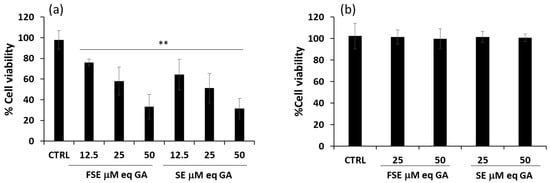FSE effect on cell viability in (a) HL-60 and (b) differentiated HL-60 cell lines. Cells were treated for 24 h with FSE or SE at the indicated concentrations. Cell viability was assessed using a CyQuant assay as reported in Materials and Methods section. Bar graphs represent the mean of three experiments (±SD). Symbols indicate significance: p < 0.005 (**) respect to CTRL (DMSO-treated cells).