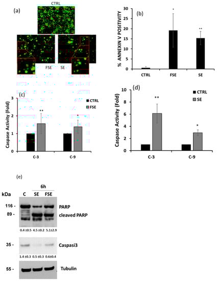 The immunoblottings in Figure 5e further confirm the activation of caspase-3, since the total protein expression was strongly reduced after 6 h of treatment with both FSE and SE, and in parallel, a significant proteolytic cleavage of PARP was triggered.