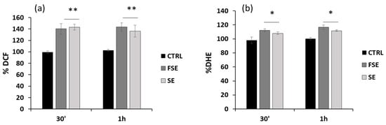 Pro-oxidant effect of FSE in HL-60 cells. Cells were treated with 50 μM eqGA of FSE and SE at the indicated time and intracellular (a) ROS and (b) superoxide were measured as DCF and DHE fluorescence, respectively. Bar graphs represent means of three separate experiments. ± SD Symbols indicate significance: p < 0.05 (*) and p < 0.005 (**) respect to CTRL.