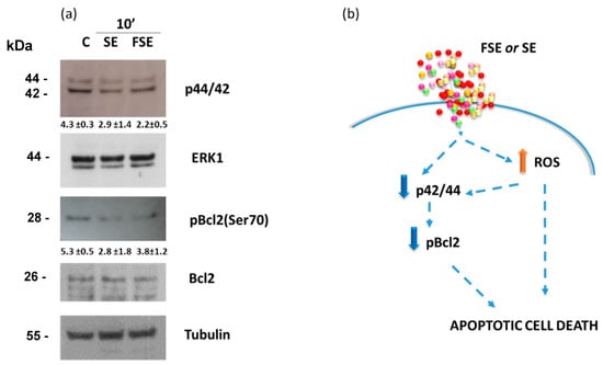 The Bcl-2 protein and the ERK/MAPK pathway are key actors involved in triggering and regulating the apoptotic process [45,46]. The immunoblot in Figure 7 shows that FSE and SE are able to inactivate the ERK/MAPK pathway (by about 1.9- and 1.5-fold, respectively) in HL-60 cells after only 10 min of incubation. Moreover, a reduction of about 1.4- and 1.9-fold of the phosphorylated form of Bcl2 (pBcl-2Ser70), the active form of the protein, was also observed, probably as a consequence of extracellular signal-regulated kinase (ERK) inhibition. In fact, the anti-apoptotic protein Bcl-2 is a key factor in resistance to apoptosis and is considered one of the hallmarks of cancer. The post-translational modifications of Bcl-2 family members are essential in anti-apoptotic activity. In particular, the phosphorylation of Bcl-2 at serine-70, mainly by the mitogen-activated protein (MAP) kinases such as ERK, c-Jun N-terminal kinase, and p38, has been shown to increase sequestration of the pro-apoptotic protein BAX [47,48,49,50], resulting in resistance to apoptosis. These data may suggest that bioactive compounds present in FSE rapidly act on the ERK signaling with a possible consequent reduction in Bcl2 post-translational modification.
