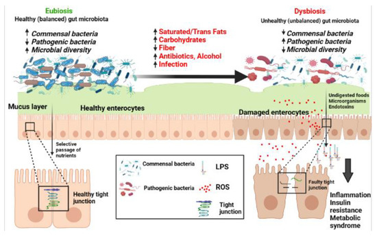 The dysbiosis of gut microbiota is defined as an altered microbial community with an increased population of pathogenic bacteria resulting in the increased release of bacterial endotoxins, especially lipopolysaccharides (LPS) that can alter the function of the intestinal barrier on a fundamental level by LPS-induced damage of enterocytes, leading to increased intestinal permeability. The intestine becomes “leaky,” allowing for the passage of LPS into the bloodstream, in turn activating inflammatory pathways resulting in systemic inflammation and potentially metabolic disorders [15,16,17,18].