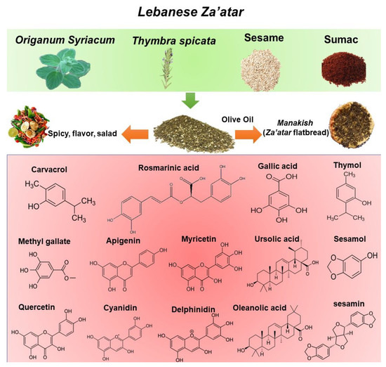 The term “Za’atar” is used to refer to both a type of plant as well as to a mixture of plants and spices [25]. Za’atar plants include Origanum, Satureja, Thymbra, and Thymus with high content of essential oil content, especially carvacrol and thymol [22,23,24]. As a mixture, the composition of Za’atar can vary by region and household, usually depending on the local availability of ingredients. Typically, in Lebanon, Za’atar mixture includes dried leaves of Origanum syriacum (also referred to as Za’atar) and Thymbra spicata (also known as wild Za’atar) mixed with Rhus coriaria ground fruit (sumac), toasted sesame seeds, and salt (Figure 2). Za’atar is commonly mixed with olive oil to form a spread for Lebanese flatbreads named “Mankoushe” [26]. The detailed components and polyphenolic composition and contents of the Za’atar mixture are shown in Figure 2.