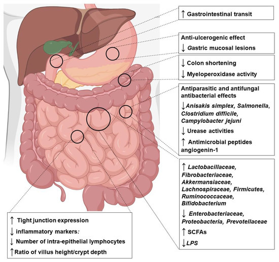 As shown in Table 2 and Table 3, several experimental studies in animals and humans have reported that Za’atar components may exert prebiotic-like effects on gut microbiota by enhancing the growth of beneficial bacteria (e.g., Lactobacillus spp., Bifidobacterium spp., fiber-fermenting, and butyrate-producing bacteria) and reducing the relative number of potentially harmful and pathogenic bacteria (e.g., Clostridium spp.). Additionally, Za’atar components may be beneficial in the treatment of intestinal inflammatory diseases and leaky gut syndrome. Numerous studies have reported the potential antioxidant and anti-inflammatory effects of Za’atar compounds in experimental models of intestinal disease in animals and humans (Table 2 and Table 3). Based on a review of the available studies, we show that Za’atar compounds may significantly reduce intestinal permeability by increasing the level of tight junction proteins and by maintaining gut epithelial integrity. The overall possible effects of Za’atar on gastrointestinal tract are depicted in the Figure 3.