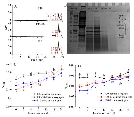 The characterization of F30, F30-10, or F10-dextran conjugates was evaluated by measuring the absorbance values at 304 nm (A304) and 420 nm (A420), which represent the content of Amadori compounds and melanoidins formed in the initial or final stages of the Maillard reaction, respectively. As shown in Figure 1C, as the incubation time increased, the A304 for all conjugates gradually increased, indicating that covalent conjugation indeed occurred between F30, F30-10, or F10 and dextran. The A420 exhibited the same change tendency. In the final stage of the Maillard reaction, the advanced products such as melanoidins with a deep color and unacceptable aroma were formed, resulting in an increase in the degree of browning. In addition, the F30-dextran conjugate showed higher A304 and A420 nm than the F30-10-dextran and F10-dextran conjugates, indicating that the high MW SPIH tended to undergo the Maillard reaction to a great extent. Li et al. [18] investigated the effects of the hydrolysis degree on the functionalities of the rice protein hydrolysate-saccharide conjugates and the results showed that the high hydrolysis degree caused a movement of lysine to a more hydrophobic region, making it difficult for the reactive −NH2 to conjugate with saccharide. Therefore, the relatively lesser A304 and A420 found in the F30-10- or F10-dextran conjugate was probably related to the more exposed hydrophobic groups in these relatively small MW hydrolysates.