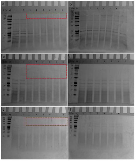 SDS-PAGE patterns of F30-dextran conjugate (a), F30 (b), F30-10-dextran conjugate (c), F30-10 (d), F10-dextran conjugate (e), and F10 (f) incubated at 60 °C for 0–24 h (M, Marker; for graph a, c, and e, lane 1 represents the F30, F30-10, or F10; lanes 2–8 represent the conjugates incubated for 0, 2, 4, 6, 12, 18, and 24 h; for graph (b) and (d), lanes 1–7 represent the F30 or F30-10 incubated for 0, 2, 4, 6, 12, 18, and 24 h; for graph (f), lanes 1–6 represent the F10 incubated for 2, 4, 6, 12, 18, and 24 h; the red-dotted box indicates the possible F30, F30-10, or F10-dextran conjugate formed during glycosylation).