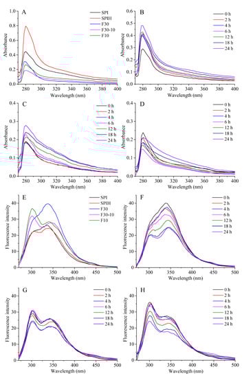 Ultraviolet spectra (A–D) and fluorescence spectra (E–H) of SPI, SPIH, F30, F30-10, and F10 (A,E), and F30-dextran (B,F), F30-10-dextran (C,G), and F10-dextran (D,H) conjugates incubated for 0, 2, 4, 6, 12, 18, and 24 h.