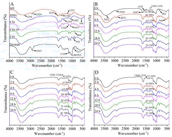 FTIR spectra of SPI, SPIH, F30, F30-10, and F10 (A); F30-dextran (B); F30-10-dextran (C); and F10-dextran (D) conjugates incubated for 0, 2, 4, 6, 12, 18, and 24 h.