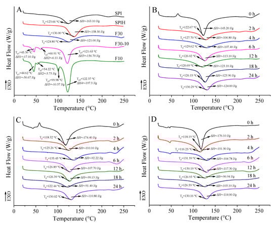 Thermograms of SPI, SPIH, F30, F30-10, and F10 (A); F30-dextran (B); F30-10-dextran (C); and F10-dextran (D) conjugates incubated for 0, 2, 4, 6, 12, 18, and 24 h.