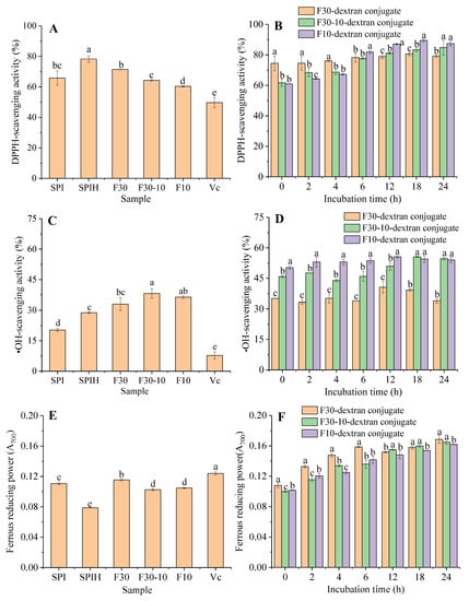Antioxidant activities of the SPI, SPIH, F30, F30-10, F10, and VC (A,C,E) and F30/F30-10/F10-dextran conjugates (B,D,F) incubated for 0, 2, 4, 6, 12, 18, and 24 h. (Different letters for conjugates incubated at the same time represent the significant difference, p < 0.05.)