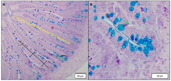 (A) Histomorphological depiction of a normal small intestine. Enterocytes are located within the small intestine villi, and goblet cells are the blue cells within the enterocyte (red circle). The crypt villus axis is represented with a yellow bar demonstrating where the axis is located. The following variables were measured: villus surface area (depicted in black) and crypt depth (depicted in green). (B) Histomorphological depiction of a normal small intestinal crypt. Paneth cells (yellow arrow, pyramidal shape) play a key role in innate intestinal immunity and homeostasis. The following variables were measured: goblet cell diameter (red) and Paneth cell diameter (green). The type of goblet cell shown for the goblet cell diameter measurement example represents an acidic goblet cell: the predominant goblet cell type found in the study.