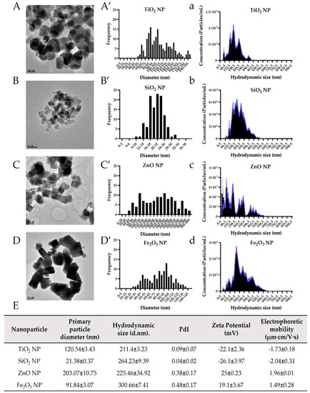 Food-grade nanoparticles (NP) characterization. Transmission electron microscopy (TEM) images of TiO2 NP (A), SiO2 NP (B), ZnO NP (C), and Fe2O3 NP (D) in dry form. Frequency histogram of the primary particle diameter (nm) measured from TEM images (A’−D’). Particle size distribution of hydrated NP measured by NanoSight nanoparticle tracking analysis (NTA) technique using dynamic light scattering (a–d). Table summarizing the average of the primary particle diameter (nm), hydrodynamic size (nm), polydispersity index (PdI), zeta potential values (mV), and electrophoretic mobility (µm·cm/V·s) of each NP (E). Data are shown as mean ± SEM.
