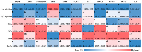 Effect of the intraamniotic administration of food-grade nanoparticles (NP) on duodenal gene expression of nutrient transporters, brush border membrane functional proteins, and pro-inflammatory cytokines. Gene expression has been normalized to the 18S housekeeping gene. Values are the means ± SEM, n = 6. Per gene (in the same column), blue depicts lower gene expression levels, and red depicts higher gene expression levels. a–c Per gene (in the same column), treatment groups not indicated by the same letter are significantly different according to one-way ANOVA with post hoc Duncan test (p < 0.05). NI = non-injected. DcytB, Duodenal cytochrome b; DMT1, Divalent metal transporter 1; ZIP1, Zinc Transport Protein 1; ZnT1, Zinc transporter 1; SGLT1, Sodium-glucose cotransporter 1; SI, Sucrase isomaltase; MUC2, Mucin 2; NF-ΚB, Nuclear factor Kappa B Subunit 1; TNF-α, Tumor necrosis factor-alpha; IL8, Interleukin 8.