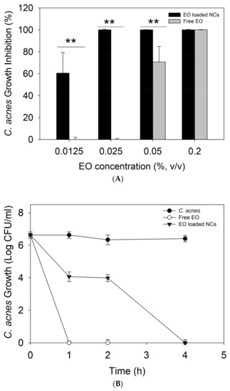 Plant-derived antimicrobials have gained significant attention as being more efficient against both susceptible and resistant bacteria than other antibiotic alternatives, with lower potential for resistance development. Although the strong anti-C. acnes activity of natural oils, such as cloves, cactus, and tea tree, has been previously described, their enhanced bactericidal effect due to the nano-size transformation has not yet been reported [31]. Our results demonstrated up to 8-fold increase in the antimicrobial activity of oregano oil against C. acnes upon nanoformulation (p < 0.05). A complete inhibition (100%) of bacterial growth was observed for the EO-loaded NCs at 0.025% (v/v) of the oil, while 0.2% of the bulk active was needed to achieve the same effect (Figure 3A). It is noteworthy that the antibacterial effect of the empty NCs, without the EO, was also evaluated, but any activity against C. acnes was not observed. These results are in agreement with our previous works validating nano-scale transformation as an innovative approach potentiating the antibacterial performance of different actives, including biopolymers, EO, enzymes, and metals, mainly due to improved interaction and disturbance of bacterial membrane [19,32,33].