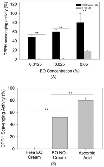 (A) Antioxidant activity of bulk EO and EO-loaded NCs, (B) free DPPH radical scavenging by the free EO and EO-loaded NC creams, and (C) cellular antioxidant activity of the free EO and EO-loaded NC creams. All experiments were performed in triplicate, and the data are expressed as the mean ± standard deviation. ** stands for p < 0.05, considered statistically significant.