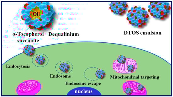 Harashima’s group has demonstrated the potential of lipid-based formulations as a means of delivering poorly water-soluble drugs, with mitochondria-targeting being a promising therapeutic strategy [33,34,35]. To this end, we developed a novel nanoemulsion system using DQA and α-TOS as emulsifiers (DTOS emulsion) and anticancer agents. Figure 1 shows the representation of the DTOS emulsion’s mechanism of cellular uptake and mitochondria-targeting. The high-pressure homogenization process was used to achieve mono-dispersion, and the combination of DQA and α-TOS was used to enhance stability. Various mole ratios of DQA and α-TOS were evaluated to determine the optimal conditions for encapsulation efficiency and stability. The DTOS 5-5 emulsion was selected for in-depth examination and its stability was found to be consistent for three years when stored at room temperature. The efficacy of its anticancer properties was also observed to be unchanged for three months. Treatment of HeLa cells with the DTOS emulsion resulted in increased cellular uptake and alteration of mitochondrial potential. This treatment led to over 70% inhibition of cell growth in cervical carcinoma (HeLa cells), breast cancer (MCF-7 cells), and murine melanoma (B16F10 cells). Furthermore, the DTOS emulsion demonstrated its anticancer potential in both 3D models (HeLa spheroid) and HeLa cells xenografted onto zebrafish larvae. These results suggest that the combination of DQA and α-TOS can be used to create a nanoemulsion for mitochondria-targeting in cancer therapy.