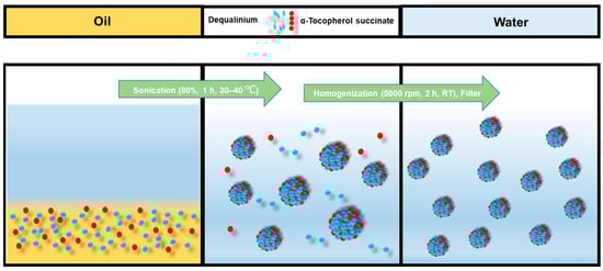 DQA chloride and α-TOS were dissolved in castor oil and sonicated for 15–20 min. Then, 10 mL of water was added, and the solution was sonicated again for 30 min to 1 h, and then the solution was homogenized. The solution was then filtered with a 0.8 μm filter. The emulsion formulation process is shown in Figure 2.