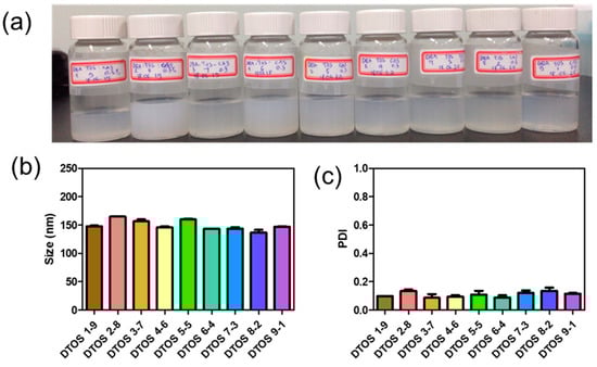 The stability of the DTOS emulsion. (a) Mean DLS diameter of the DTOS emulsion at a defined time. (b) Mean polydispersity index of the DTOS emulsion at a defined time. (c) DTOS emulsion stability under different temperatures at a specified time. The data are presented as the mean value ± standard deviation of triplicate experiments.