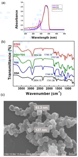 (a) UV-Vis absorption spectra of α-TOS, DQA, and DTOS emulsions. (b) FTIR spectra of α-TOS, DQA, the mixture of DQA and α-TOS, and DTOS emulsions. (c) Field emission scanning electron microscopy of DTOS 5-5.