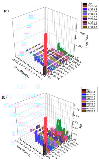 The emulsions were stored at room temperature. The size was confirmed at a certain time using an ELS-Z particle size analyzer (Otsuka Electronics, Otsuka, Japan). Figure 5 shows the stability of the emulsions depending on the amount of the DQA and α-TOS. The emulsion containing only DQA and castor oil (DQA emulsion) was not stable, and its size changed after 2 weeks, and the PDI value also increased. This indicates that the DQA emulsion cannot avoid the aggregation of oil droplets after forming nanoparticles. α-TOS plays an important role of a co-surfactant in stabilizing the emulsion, which is a good indicator for the application of our emulsion. The sizes of DTOS 3-7, DTOS 4-6, DTOS 5-5, DTOS 6-4, and DTOS 7-3 emulsions were stable for over two years at room temperature (Figure 5a). However, the PDI value of DTOS 5-5 was the most stable (Figure 5b). Therefore, the DTOS 5-5 emulsion was selected for further experiments. The HeLa cells were tested for the anticancer effect of DTOS 5-5 when fresh and after storage at room temperature for 1 and 3 months. Figure S2 revealed that the bioactivity was consistently similar, implying the stability of the emulsion. However, the DTOS 5-5 emulsion was not stable at 4 °C (Figure 5c). The DQAsome has been demonstrated to be unstable under low temperatures. The mechanism of emulsion stability has been unclear until now. The combination of DQA and α-TOS increased the stability of the emulsion, leading to improved potential in nanomedicine applications.