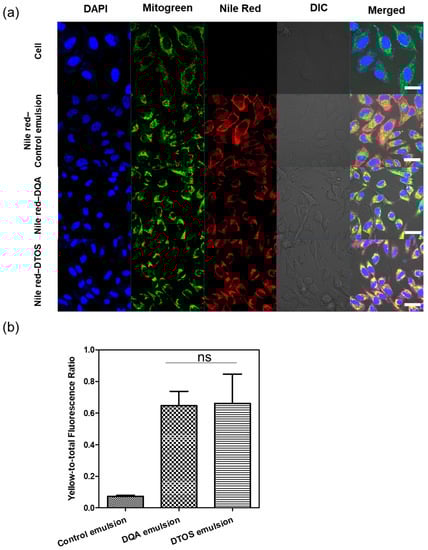 Nile red was used as a fluorescence model and was loaded into the emulsions and characterized. The Nile red emulsion was incubated with HeLa cells for 24 h. Mitochondria were stained with mitogen. The nucleus was stained with Hoechst dye and imaged using confocal laser scanning microscopy (Figure 6). The red fluorescence showed the location of the emulsion and the nanoemulsion produced a high-intensity red color, indicating that the emulsion can be taken up inside the cell membrane. The positive surface charge of nanoemulsion supports that it can effectively interact with the cell membrane, which is the first step of the endocytosis pathway. In addition, the Nile red emulsion can be localized at the mitochondria, where we can find the yellow color in the cells. The DQA and DTOS emulsions were both found to be able to efficiently target the mitochondria.