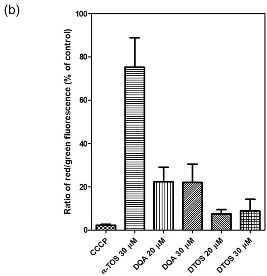HeLa cells were treated either with the DQA emulsion or the DTOS 5-5 emulsion. Mitochondrial oxidative phosphorylation uncoupler (CCCP), which has low potential, was used as a positive control. Then, the fluorescent probe JC-1 was added. The data showed a decreased red (~590 nm) to green (~529 nm) fluorescence intensity ratio in response to both DQA and DTOS emulsion exposure in relation to mitochondria depolarization, which is clearly observable in the fluorescence images. The results also showed that the impact of the DQA emulsion was less than that of the DTOS emulsion (Figure 7).