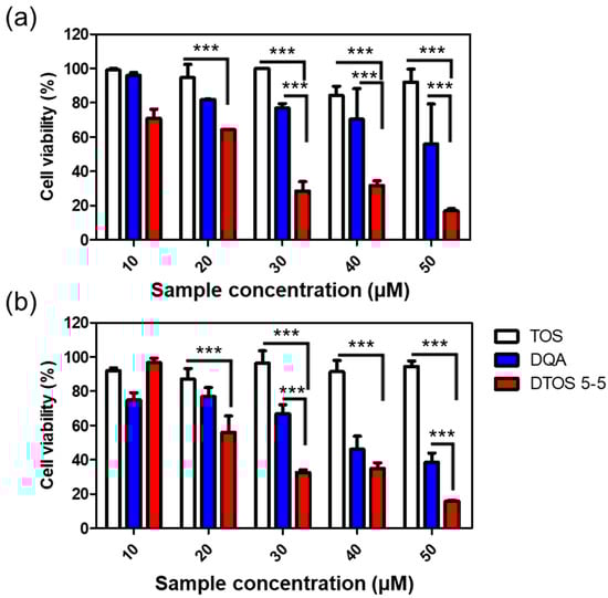 Cell viability of α-TOS, DQA, and DTOS 5-5 emulsions at different concentrations measured in HeLa cells at (a) 24 and (b) 48 h. Data points are represented as mean ± SD of four individual copies. Statistical analysis of data was conducted by one-way ANOVA with Tukey’s post-hoc test. Differences between groups were considered statistically significant at p < 0.001 (***).