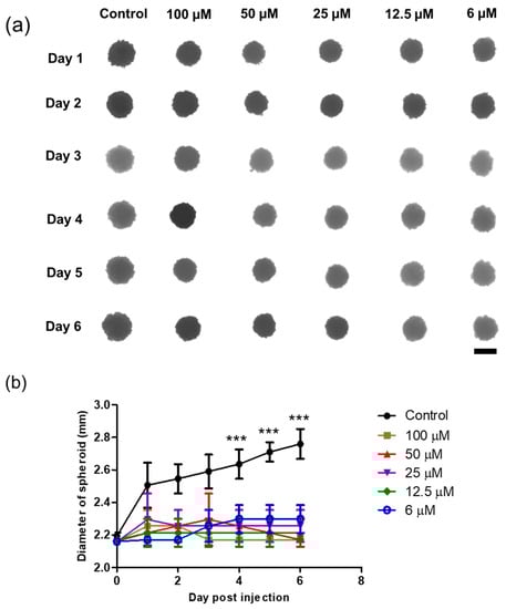 Three-dimensional spheroid study of the DTOS 5-5 emulsion. (a) Morphology and (b) diameter of spheroids. The scale bar represents 2.30 mm. A significant difference was observed between the emulsion treatment group (25 µM) and the control group. Data points are represented as mean ± SD of three individual copies. Statistical analysis of data was conducted using t-test (***, p < 0.001).