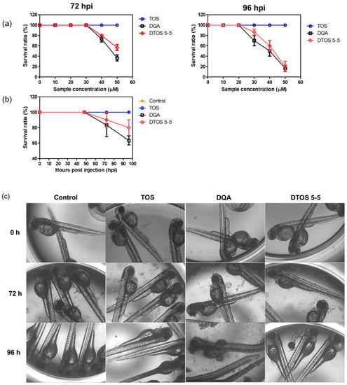 Evaluation of the in vivo toxicity of dequalinium (DQA) and α-tocopherol succinate (α-TOS) (DTOS) emulsions in zebrafish larvae. (a) The survival ratio of zebrafish larvae after treatment with various concentrations of samples at 72 and 96 hpi. Each value represents the average and standard deviation (n = 3). (b) The survival ratio of zebrafish larvae after treatment with 30 µM at a certain time. Each value represents the average and standard deviation (n = 3). (c) The morphology of the embryos after treatment with 30 µM of samples at a certain time. hpf, hours post-fertilization.