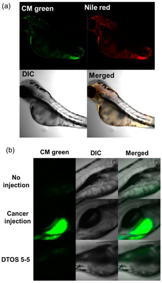 Wildtype zebrafish were cultivated in a 28 °C incubator under a photoperiod of 10D/14L. Zebrafish eggs were maintained in salt water at 28 °C. After 48 hpf, dechorionated eggs were prepared in a Petri dish. To examine the toxicity of the DQA and DTOS emulsions, larvae were incubated with the samples, after which the number of surviving larvae were counted, and the morphology of the larvae was observed. We generated the zebrafish cancer models using the HeLa cell line for biodistribution and anticancer experiments. HeLa cells were stained using a cell fluorescence tracker (CellTracker™ Green CMFDA Dye, Invitrogen, Carlsbad, CA, USA) and injected into the yolk of larvae (48 hpf) using a microinjector (≈100 cells/larva for biodistribution and ≈150 cells/larva for anticancer). To determine the biodistribution, the xenografted larvae were incubated with 20 µM of Nile red-loaded DTOS 5-5 emulsion for 2 days. For the anticancer effect, the xenografted larvae were incubated with 30 µM of Nile red-loaded DTOS 5-5 emulsion for 3 days. After the incubation, the larvae were anesthetized using 0.04% tricaine and observed under a confocal microscope (Zeiss, Oberkochen, Germany).