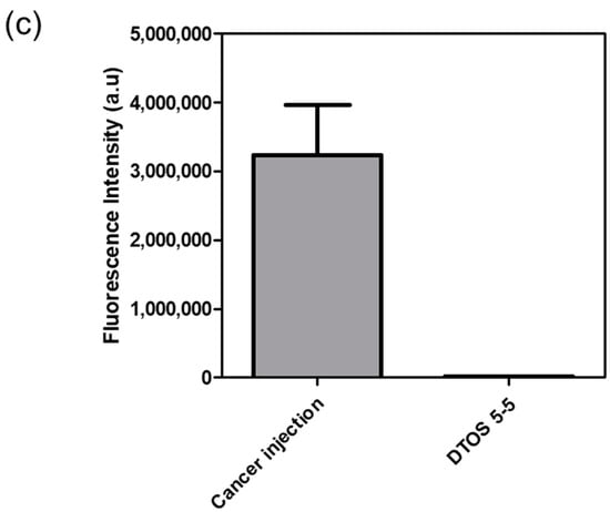 Human cancer cell xenografts in zebrafish larvae are a helpful preclinical tool in oncology research. Before evaluating the anticancer effect of the DTOS 5-5 emulsion, we examined its toxicity on the larvae. The larvae (48 h post-fertilization (hpf)) were incubated with various concentrations of the samples (10 µM to 50 µM) and observed at 72 and 96 h post-injection to record the number of alive larvae. α-TOS and DQA were used as the controls. Figure 10a showed that the α-TOS was safe for larvae even though they were treated at a high concentration. However, the DTOS 5-5 emulsion caused toxicity for larvae owing to the addition of DQA. The positive charge may interact with the fish, causing death. DTOS 5-5 doses of 10–30 µM were found to be safe for larvae. Moreover, DTOS 5-5 showed an anticancer effect at 30 µM in vitro. Therefore, we selected this concentration for further study. DTOS 5-5 at 30 µM was used to evaluate the toxicity of larvae for a certain time. The survival ratio of larvae was 80% at 96 dpi, while the DQA caused more toxicity. The morphology of the larvae was evaluated. We performed confocal laser scanning microscopy analysis to determine the biodistribution of the cancer cells and emulsion in the zebrafish larvae. We observed the HeLa cells as green and the emulsion as red. Figure 11a indicates that the cancer cell grew well on the larvae. The emulsion became distributed throughout the fish’s body. The yellow color in the merged picture indicates the colocalization of cells and emulsions. The anticancer effect was then evaluated with DTOS 5-5, 30 µM. After the xenografted model was successfully prepared, the xenografted larvae were incubated with the DTOS 5-5 emulsion for 3 days. The local cancer cells were captured. Figure 11b shows that the DTOS 5-5 emulsion inhibited the growth of the HeLa cells on the larvae. The fluorescence intensity of the cell tracker-labeled HeLa cells in the zebrafish larvae was analyzed using Image J. Less fluorescence was found in the case of the DTOS 5-5 emulsion compared to that in the controls (Figure 11c), demonstrating the strong anticancer effect of the DTOS 5-5 emulsion.