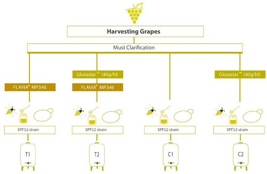 The experimental design (Figure 1) was composed of four treatments: T1, sequential inoculum of FLAVIA® MP346/S. cerevisiae SPF52; T2, the use of GlutastarTM to the bulk must and sequential inoculum with FLAVIA® MP346/S. cerevisiae SPF52; C1, single inoculum of S. cerevisiae SPF52; C2, the addition of GlutastarTM and fermentation by S. cerevisiae SPF52.