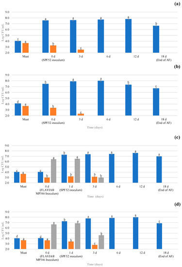 Microbiological concentration (Log CFU/mL) of samples during alcoholic fermentation: (a) C1, single inoculum with S. cerevisiae SPF52; (b) C2, glutathione-rich inactivated yeasts and single inoculum with S. cerevisiae SPF52; (c) T1, sequential inoculum with M. pulcherrima MP346/S. cerevisiae SPF52; (d) T2, glutathione-rich inactivated yeasts and sequential inoculum with M. pulcherrima MP346/S. cerevisiae SPF52. For each microbiological group, different letters indicate statistically significant values determined by using Tukey’s test (p ≤ 0.05). Legends: