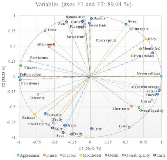 Correlations of the sensory analyses were examined by MFA. The number of sensory attributes (thirty-six variables) for the four wines made it possible to define two factors with an Eigen > 1 that represented a total variance of 89.64%. The correlation between the variables and the MFA factor was expressed by the value of the contribution and cos2. The incidence of the factors F1 (56.41%) and F2 (33.23%) on the total variance discriminated the different wines. Examining the loading plot (Figure 3), eight variables were located in both quadrants I and IV, ten were located in quadrant II and eleven were located in quadrant III.
