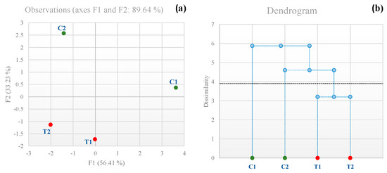 Multiple factor analysis applied to sensory analysis of Catarratto wines: (a) sample score; (b) agglomerative hierarchical clustering (AHC) dendrogram. Abbreviations: T1, sequential inoc lum with M. pulcherrima MP346/S. cerevisiae SPF52; T2, glutathione-rich inactivated yeasts and sequential inoculum with M. pulcherrima MP346/S. cerevisiae SPF52; C1, single inoculum with S. cerevisiae SPF52; C2, glutathione-rich inactivated yeasts and single inoculum with S. cerevisiae SPF52.
