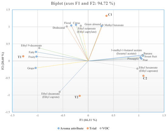 Principal component analysis (PCA) biplot for VOCs and aroma attributes. Abbreviations: T1, sequential inoculum with M. pulcherrima MP346/S. cerevisiae SPF52; T2, glutathione-rich inactivated yeasts and sequential inoculum with M. pulcherrima MP346/S. cerevisiae SPF52; C1, single inoculum with S. cerevisiae SPF52; C2, glutathione-rich inactivated yeasts and single inoculum with S. cerevisiae SPF52.