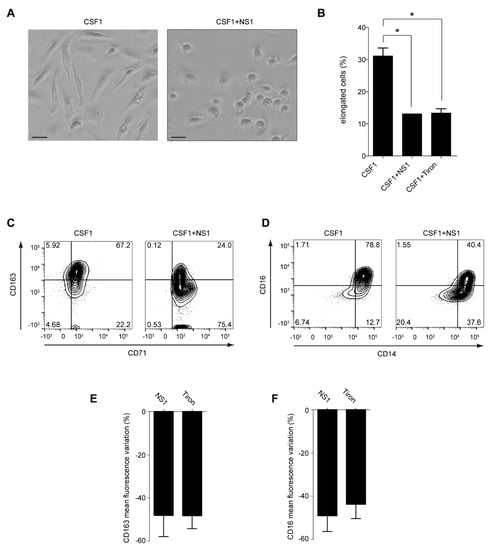 NS1 modifies macrophage differentiation. Monocytes from healthy donors were treated with CSF-1 (100 ng/mL, 3 days) in the absence or presence of NS1 (15 µM) or Tiron (500 μM). (A): Human CD14+ monocytes treated with CSF1 become adherent and elongated (left panel), a phenotype not observed after co-treatment with NS1 (right panel, scale 20 µm). (B): The fraction of cells with an elongated shape (elongation factor > 2.5) was measured in monocytes treated with CSF1, CSF1 + NS1, CSF1 + Tiron. Fisher test with Bonferroni correction. *: p ≤ 5 × 10−2 (C,D): Cytometric analysis of surface markers CD71 and CD163 (C) or CD14 and CD16 (D) of monocytes + CSF1 ± NS1. (E,F): Variation in the Mean fluorescence index of cell surface CD163 (E) and CD16 (F) expression in monocytes treated with CSF1, CSF1+ NS1, CSF1 + Tiron compared to monocytes treated with CSF1.