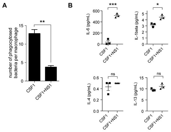 “M1” and “M2” macrophages are known to differ by their secretory repertoires, in particular cytokines and chemokines, whereas monocytes do not release these effectors. Figure 2B shows how NS1 modified the secretion of cytokines by CSF1-treated monocytes; the levels of the pro-inflammatory cytokines IL-6 and IL-1β, characteristic of a “M1”-like phenotype, were significantly enhanced by NS1. In contrast, IL-13, which is anti-inflammatory, was not significantly changed. The increase in pro-inflammatory cytokines suggests that NS1 likely shifted the macrophage phenotype toward an “M1” state, pointing out the plasticity of the macrophage phenotype as a function of their environment.
