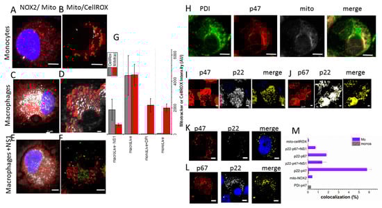 Confocal imaging of living cells (Left A–F) (A,B): monocytes isolated from blood of healthy donors; the red signal is the NOX2 and mitotracker in (A,B), respectively, the grey signal corresponds to the mitotracker and CellRox deep red reagent in (A,B), respectively; (C,D) Monocyte-derived macrophages (with CSF1-without NS1 treatment) using the same markers used for the living monocytes in (A,B); (E,F) the macrophages were treated with NS1 after their CSF1-induced differentiation from monocytes using the same markers as in (A,B); the green signal in (F) is the fluorescence of NS1; the ROS levels are quantified by the cell-permeable CellROX deep red reagent shown in light grey, the mitochondria are monitored by the red mitotracker reagent as quantified in (G); Co-localization experiments in fixed cells (Right H–L) The images (H–L) present co-localization experiments in fixed monocytes or CSF1-treated monocytes differentiated into macrophages. Each antibody is mentioned above each image, the merge, representing the colocalization is shown in yellow. The intensity of the colocalization is quantified in (M). We tested colocalization between partners of the activated NOX2 complex in “M2” macrophages formed by membrane bound NOX2 and p22phox with p67phox and p47phox (p40phox and rac1 are not labeled). It is known that p67phox and p47phox are located in the cytoplasm of the resting cells [23] in agreement with the images shown in (H); (I,J) are p22phox-p47phox and p22phox-p67phox co-localization signals in macrophages without NS1, respectively; (K,L) are p22phox-p47phox and p22phox-p67phox co-localizations with NS1, respectively. Scale bars are 3 µm. Quantification of the 3D images is shown in (M) and was performed with Imaris 7.3 software (http://www.bitplane.com/imaris, accessed on 6 February 2023).