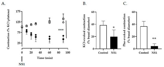 Results are expressed as percent of the contractile response to KCl at the moment of time of solvent/NS1 addition. Results are mean ± SEM of three to five independent experiments. Significant differences between groups were calculated by a two-way Anova.