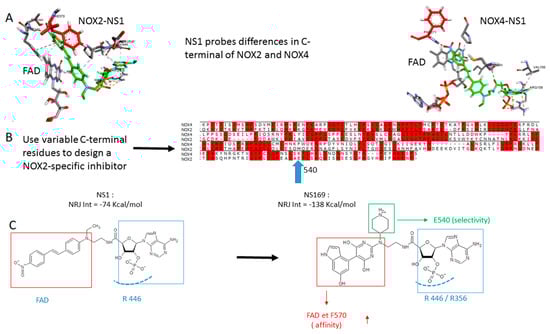 From a pan-NOX inhibitor NS1 to a NOX2-specific inhibitor NS169. (A) Comparison of the interactions of NS1 shown in green with NOX2 and NOX4; the C-terminal residue F570 in NOX2 is highlighted in red; (B) alignments of NOX2 and NOX4 C-terminal, identical residues are in red and variable residues in white; (C) Structures of NS1 and its NOX2-specific analog. The part of the compounds recognizing the conserved arginines/lysines of the protein is boxed in blue, the aromatic chromophore moieties recognizing FAD are boxed in red.