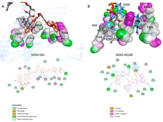 Comparison of the interactions of NS1 (A) shown in orange and NS169 (B) shown in blue with NOX2: FAD isoalloxazine is shown in grey sticks, its pyrophosphate groups in yellow (P) and red (O), the van der Waals surface is shown as H-bond donor or acceptor in violet and in green. Below are the 2D interaction maps between the inhibitors and interacting residues of NOX2, each residue being depicted according to the following color codes.